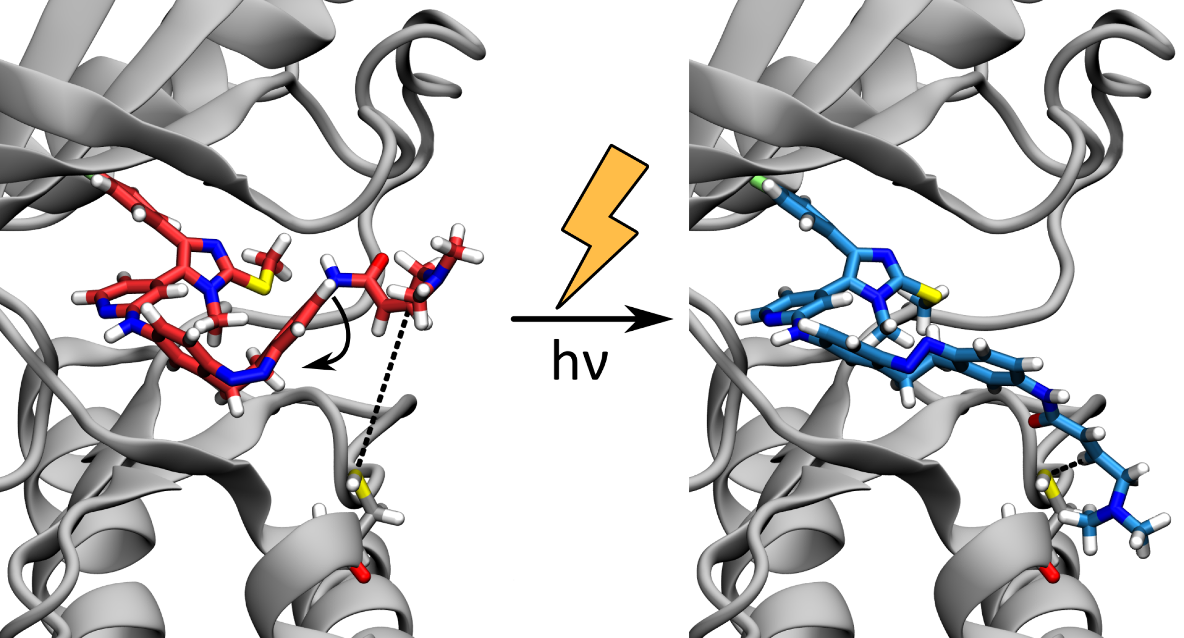 Mit Molekulardynamiksimulationen untersuchte die Gruppe, wie die verschiedenen Formen des lichtschaltbaren Wirkstoffs mit dem Zielenzym interagieren und warum nur die durch Licht aktivierte Form aktiv ist. Durch das Strecken des Photoschalters kommt der Wirkstoff in Kontakt mit einem Cystein im Zielenzym. Es entsteht eine chemische Bindung zwischen Wirkstoff und Protein: Die Funktion des Enzyms wird unterbunden. Der Wirkstoff kann zwar wieder in die „inaktive“ Form zurückgehen, die Blockade des Enzyms bleibt aber weiterhin bestehen. Der Zustand des Wirkstoffs beeinflusst zudem die Form und Beweglichkeit des Enzyms.