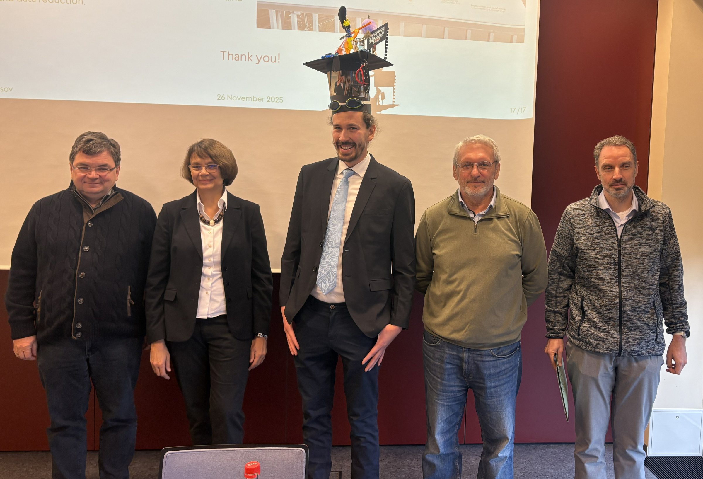 Artemiy Belousov (Mitte) mit dem Prüfungsteam nach erfolgreicher Verteidigung seiner Doktorarbeit.
