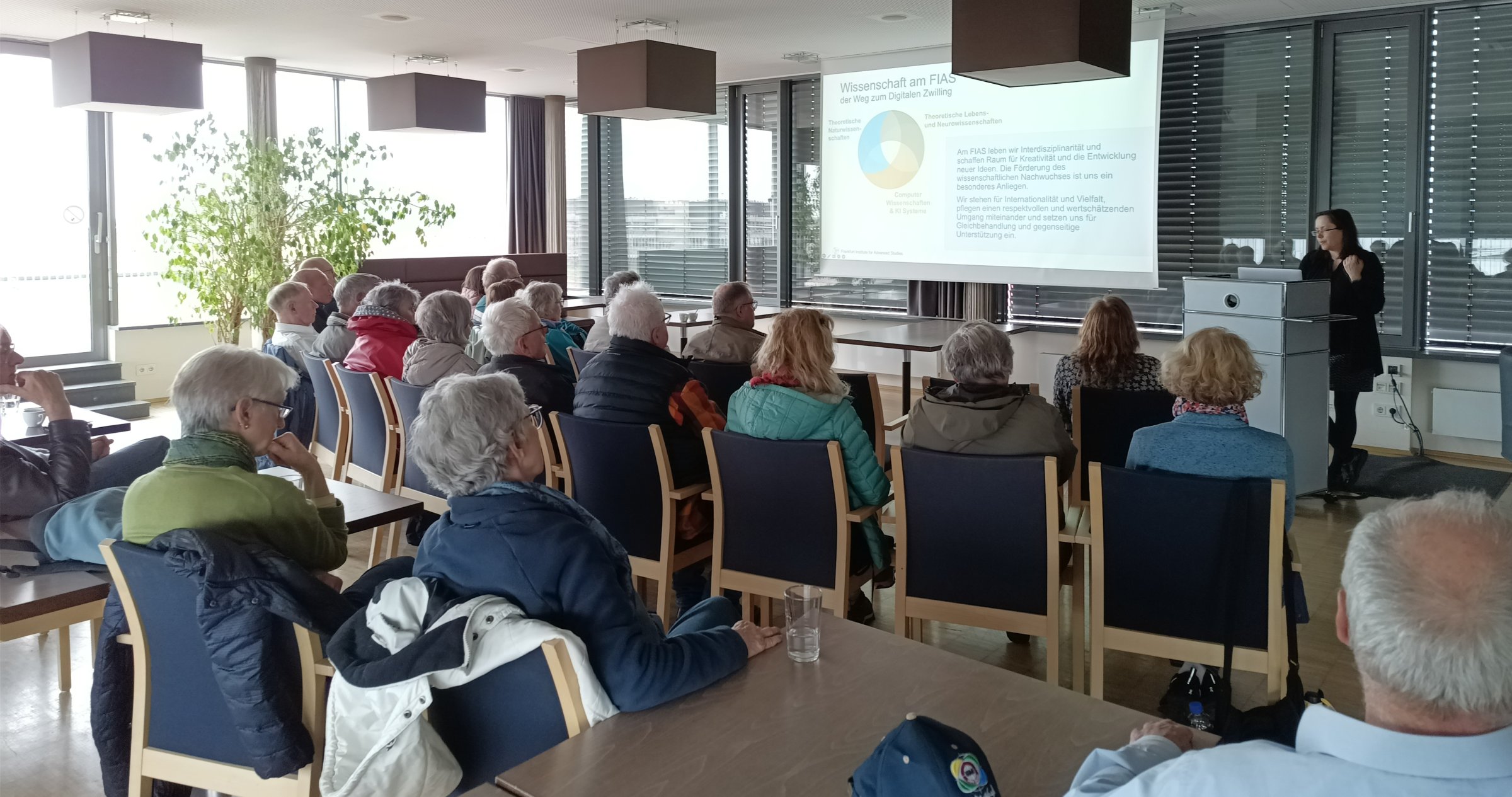 24 Studierende der Universität des 3. Lebensalters waren am 17. April zu Gast am FIAS. Mit großem Interesse lauschten sie dem Vortrag von FIAS-Fellow Franziska Matthäus über die Forschung am FIAS.